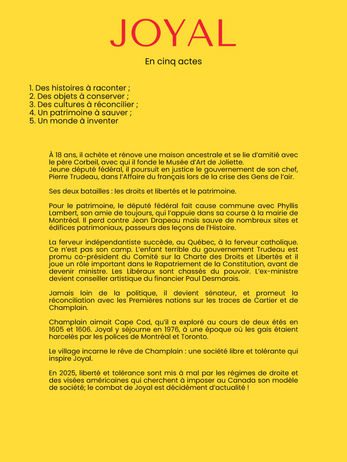 Enfant modèle, enfant terrible, Serge Joyal crée à 22 ans le Musée d’art de Joliette, poursuit en justice le gouvernement de P.E. Trudeau et dispute la mairie de Montréal à Jean Drapeau en 1978. Ministre et sénateur, il défend les droits des minorités contre les préjugés de la majorité. Au moment où le Canada est menacé de devenir le 51ème État américain, il défend le modèle de société humaniste qu’il a contribué à construire. JOYAL est le portrait audacieux d’un politicien atypique, nationaliste et fédéraliste, amoureux de culture, défenseur du patrimoine, champion de la mémoire collective et des libertés individuelles.